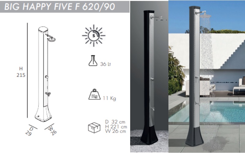 Arkema Solar buitendouche F620/90 Big Happy Five, Anthracite met roestvrijstalen afwerking, UV-bestendig, HD polyethylene. Capaciteit 40 liter, Gewicht 11 kg Hoogte 215 cm inclusief mixer.