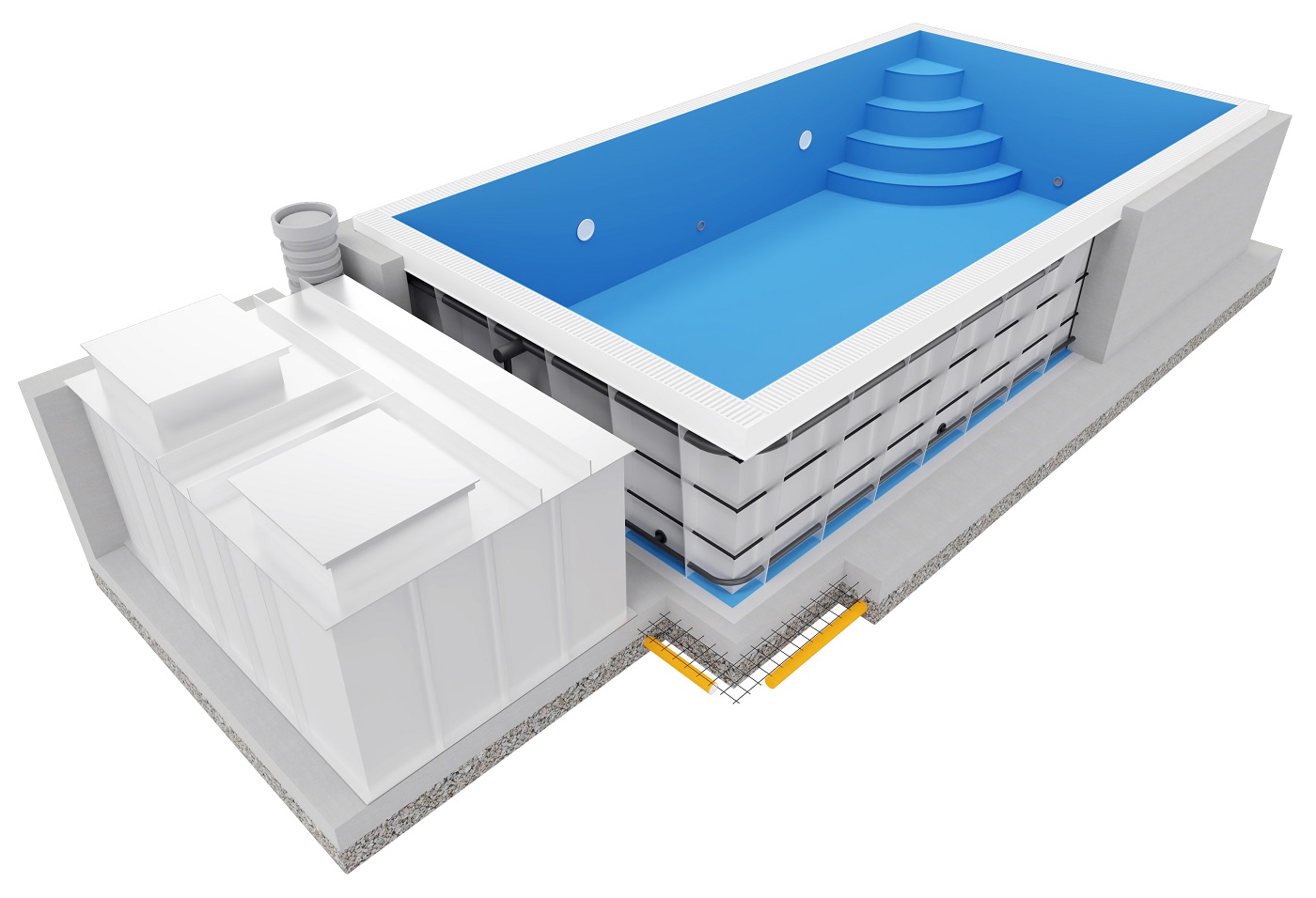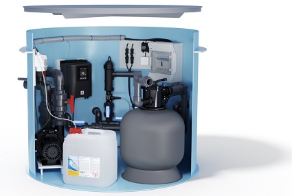 Optioneel kan een volledige technische installatie worden meegeleverd zoals zandfilter, pomp, dosering, desinfectie en besturing.