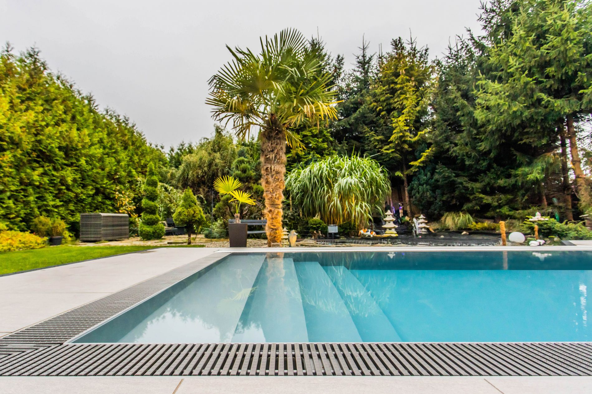 Het belangrijkste voordeel van overloopzwembaden is 100% gebruik van de diepte van het zwembad en een perfecte fusie met het profiel van de tuin.
