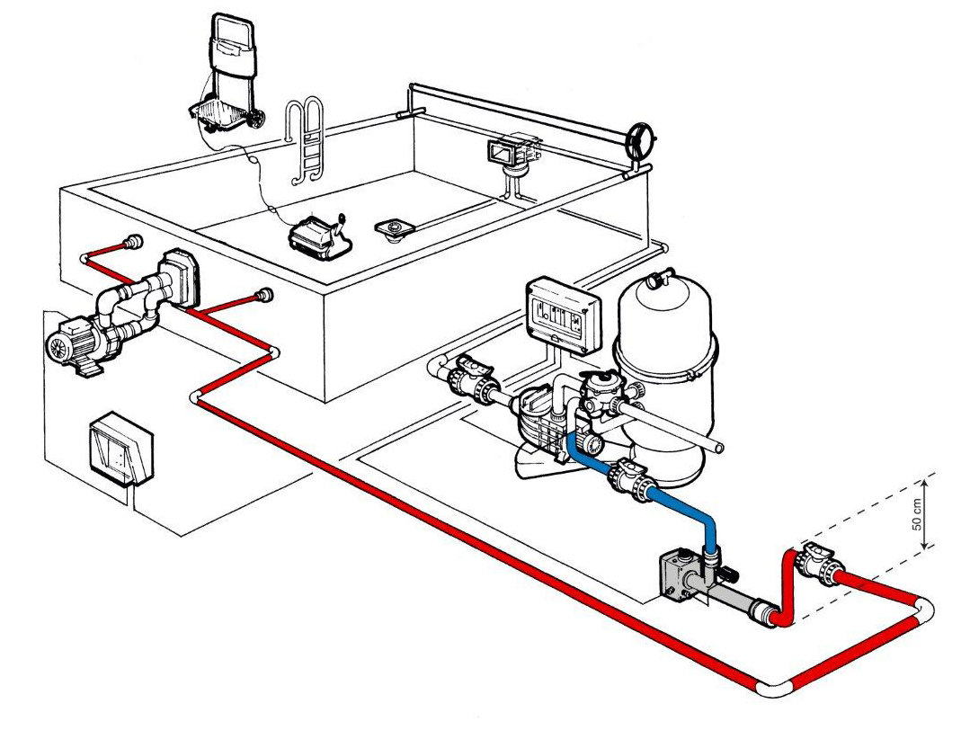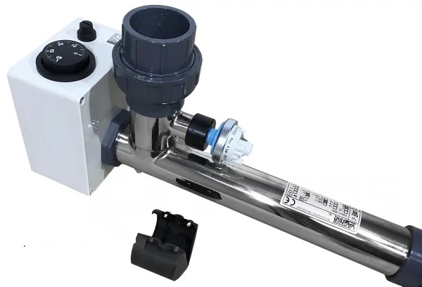 De elektrische verwarming is voorzien van een drukschakelaar. Dit is een veiligheidselement dat ervoor zorgt dat als het zwembadwater niet door de heater stroomt, de verwarmingsspiraal ook niet werkt. Elektrische verwarming mag in geen geval zonder water worden gestart.