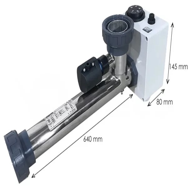 De verwarmingsmantel is gemaakt van roestvrij staal AISI 316 bestand tegen hoge temperaturen en chloor. De verwarmingsspiraal is gemaakt van roestvrij staal met TITANIUM-toevoeging. De verwarming is geschikt voor alle behandelingen van zwembadwater behalve behandelingen met zout water.