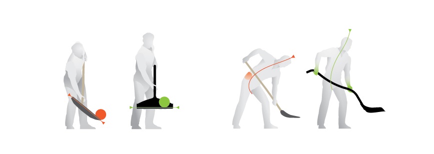 De bocht aan het einde van het handvat dient als »roer« voor het effectief manoeuvreren en duwen van de schop.