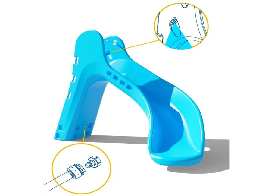 De glijbaan beschikt over een waterafvoer om de slang op een zeer eenvoudige manier aan te sluiten. De waterinlaat bevindt zich achter de trap, waardoor de slanginstallatie verborgen is. Zodra je de slang hebt aangesloten, komt er water uit de twee sproeiers op de bovenste veiligheidsbeugel van de glijbaan, zodat het glijgedeelte altijd nat en glad blijft. Het is compatibel met standaard waterslangen en kan ook op zout water worden aangesloten.