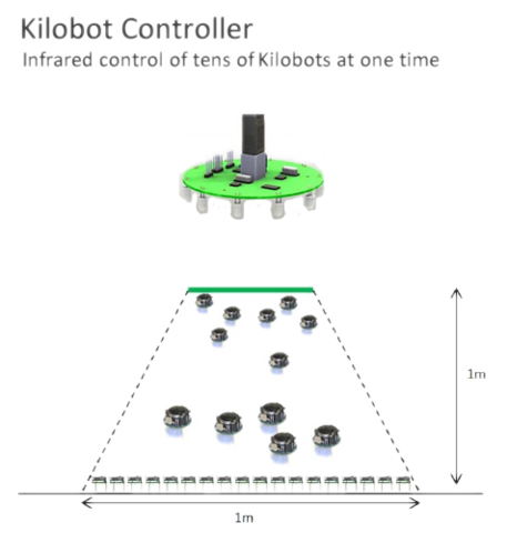 Het Kilobot controller board met de controller software kan een grote hoeveelheid robots tegelijk beheren. Het kan communiceren met Kilobots hieronder met behulp van infrarood licht waardoor een gebruiker om: