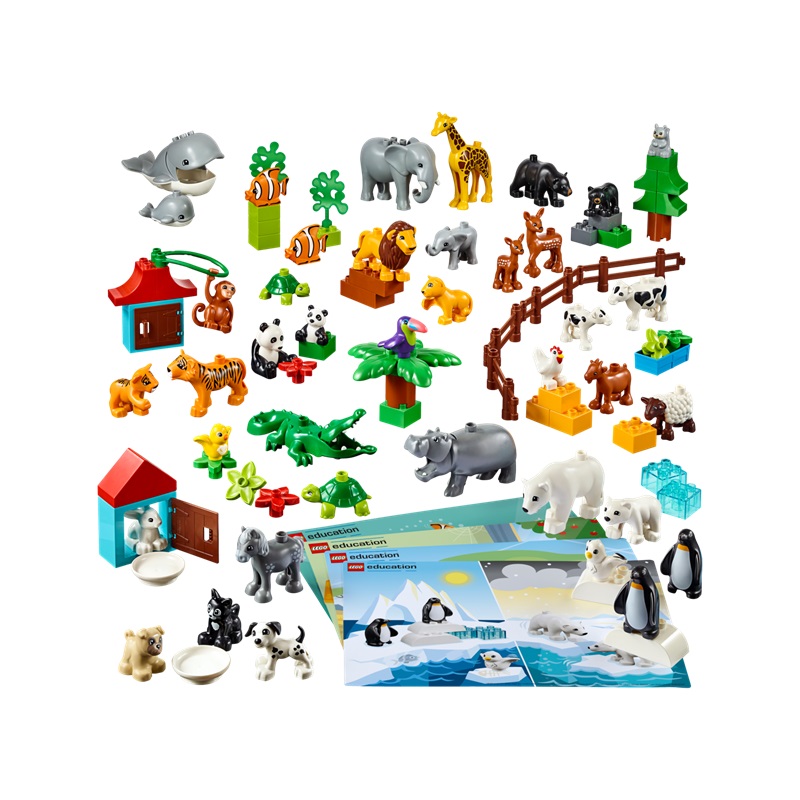 Deze Early Learning-set bestaat uit 91 LEGO DUPLO® elementen, waaronder 40 wilde dieren, boerderijdieren en huisdieren, plus vier dubbelzijdige inspiratiekaarten waarop acht verschillende leefomgevingen staan afgebeeld, waardoor kinderen leren wat dieren nodig hebben en wat hun verschillen zijn.
