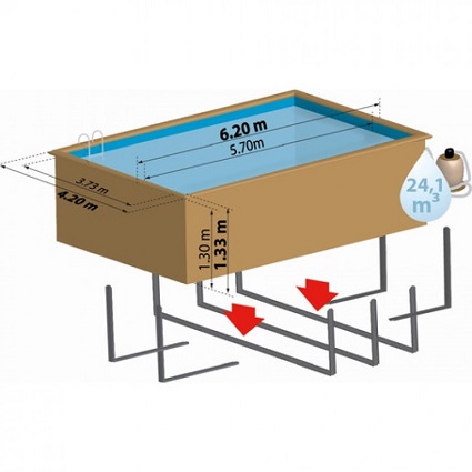 Het resultaat dat met deze zwembaden wordt bereikt, is veruit superieur aan andere zwembadreeksen zoals buisvormig of staal. Dit is te danken aan de kwaliteit van het massief hout en de robuustheid van de constructie. Het moet op een gladde, stevige en volledig vlakke vloer worden geïnstalleerd. Een betonnen ondergrond is absoluut noodzakelijk en het wordt sterk aanbevolen om een betonplaat van 700 x 500 x 17 cm te plaatsen.