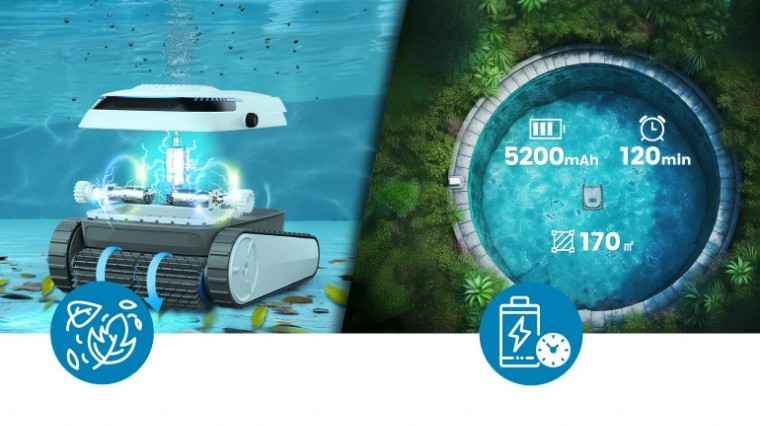 De RobotVac Fraser zwembadrobot is uitgerust met drie 80W-motoren en heeft een filtercapaciteit van 150 l/min. De draadloze werking wordt mogelijk gemaakt door een 5200 mAh lithiumbatterij, waarmee tot 120 minuten continu gebruik mogelijk is op één lading. Opladen duurt slechts 150 minuten, waardoor de robotreiniger snel weer klaar is voor gebruik.