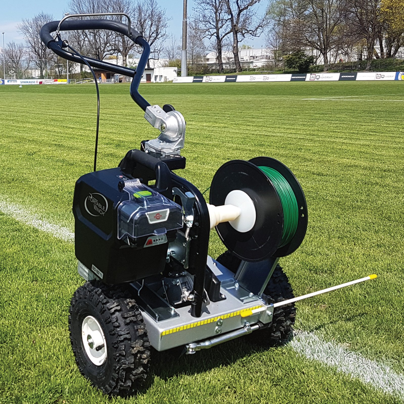 Professionele kabellegger van Portable Winch voor het leggen van perimeterdraad. Werkt zeer snel en eenvoudig tot 420 meter per volle accu. U hoeft geen draadpennen te gebruiken aangezien deze kabellegger het perimeterdraad tot 6cm onder de graszoden aanbrengt. Er is dus ook geen gevaar voor het eventueel verticuteren van uw gazon. De gewenste accu kan naar wens worden meegeleverd.
