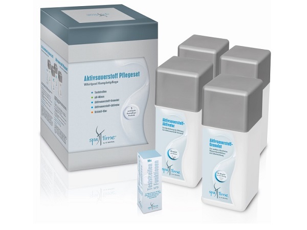 Dankzij de Kalk-Ex hardheidsstabilisator zijn metalen in het water gebonden en worden verkleuring en kalkaanslag voorkomen. Een correct ingestelde pH-waarde is de basis voor optimale waterverzorging. Actieve zuurstofkorrels in combinatie met actieve zuurstofactivator worden gebruikt voor de zachte, geurvrije desinfectie van uw whirlpoolwater zonder chloor. Met de SpaTime-teststrips kunnen de waterwaarden snel en eenvoudig en bepaald worden op basis van de kleurschaal.
