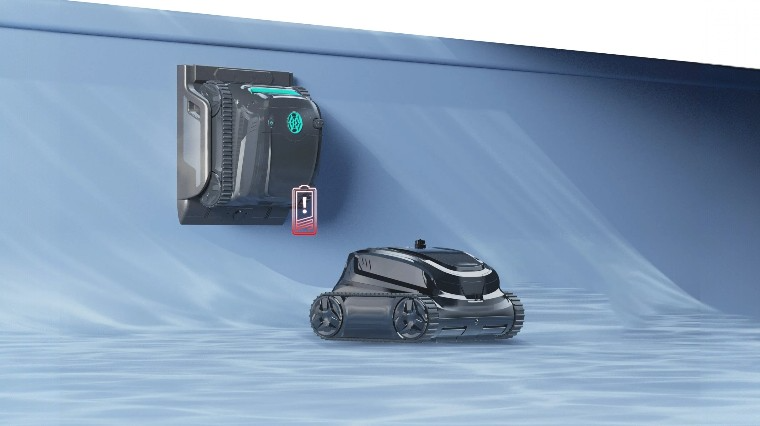 Omdat de Wybot S2 PRO zwembadrobot draadloos is, moet de batterij regelmatig worden opgeladen. Aangezien het laadstation zich in het zwembad bevindt, hoeft u de robot niet uit het water te halen. Hij keert automatisch terug naar het station wanneer het batterijniveau onder de 20 procent komt. Zodra het groene indicatielampje op de zwembadrobot gaat branden, is hij weer klaar voor gebruik.